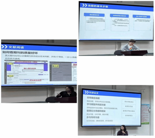 交流会上,韩梅雨、李泽鹏、成珏三位同学从不同维度为参会同学分享经验。韩梅雨同学就文献阅读、科研工具推荐、数据获取途径和经验感悟四个方面进行分享,李泽鹏同学以论文选题和开题报告为主题,介绍了选题的基本原则、基本步骤和实操思路,成珏同学则从学习和实践两个方面,建议同学们不断提升学术水平、备考专业相关证书并积极参加文体活动。