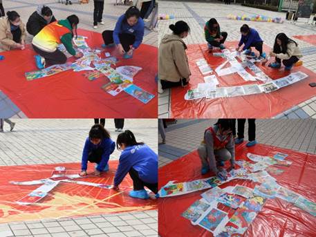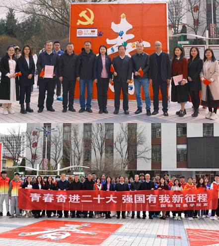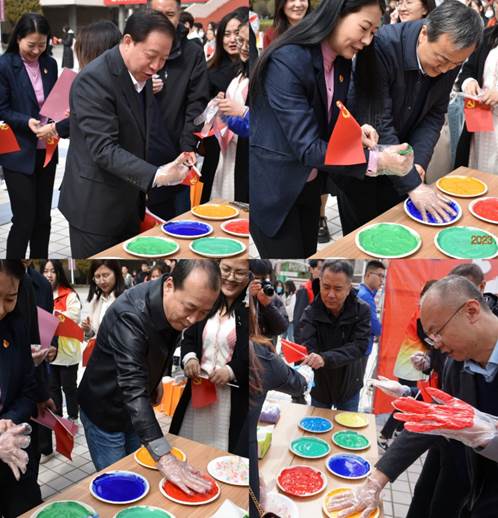 316日,清风吹拂,春回大地。修德楼南侧广场“青春奋进二十大”七个醒目的大字引起了百余名师生驻足观看,镜头聚焦,原来是SEX8 党委引领青年花式学习党的二十大精神的活动现场,观者如市,如火如荼。中午12:00,校党委副书记张永德,宣传部、学生工作部、保卫部、文化旅游与新闻艺术学院、法学院等部门负责人与青年一道在“青”字上拓印留念,题词签名,掀开了“青春奋进二十大”主题活动的序幕,邂逅中国红,同心颂党恩。